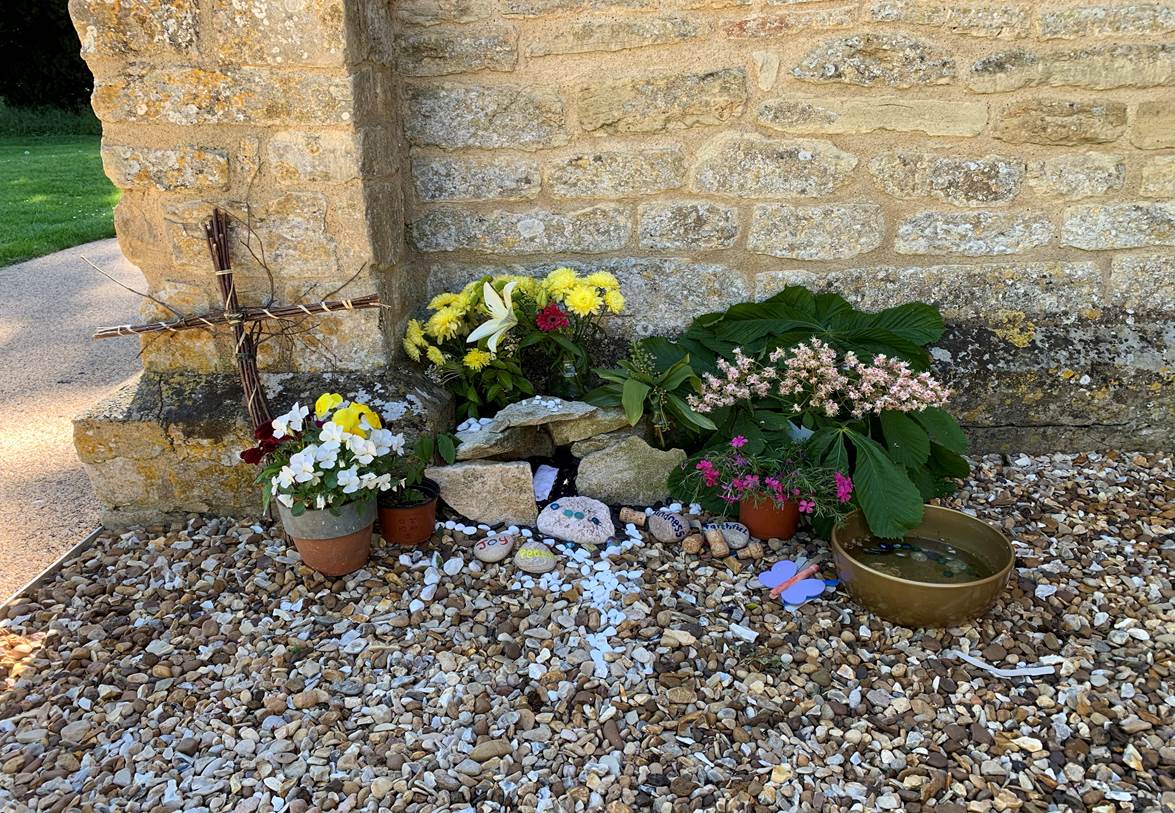 We sit beside the empty tomb of the Easter garden and at the same time we look out at the fields, the gift of creation. Take a stone and as you put it in the water leave your worries with God. |
